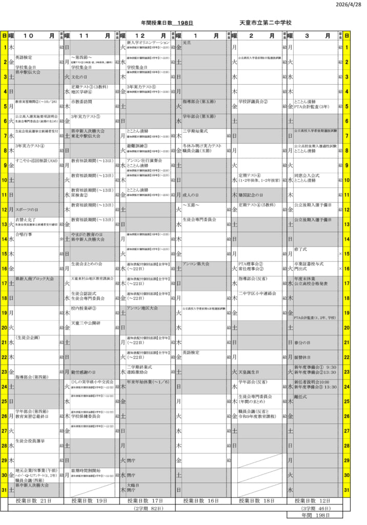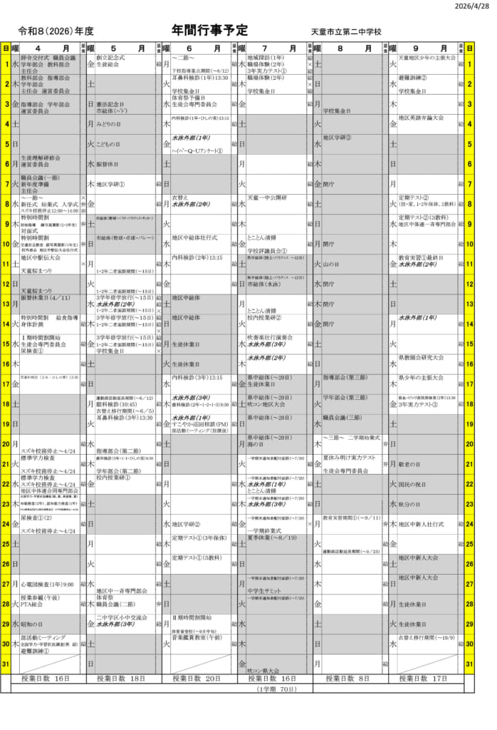 天童市立第二中学校年間計画令和8年度 年間計画