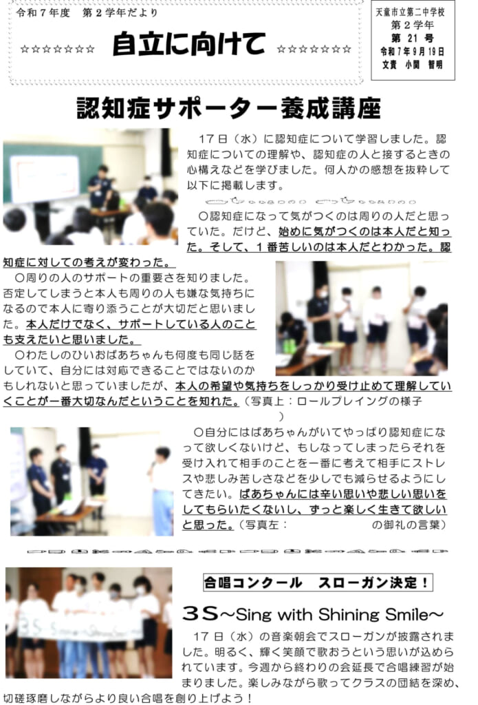 天童市立第二中学校2学年特設サイト学年通信第2学年だより 21号 令和7年9月19日