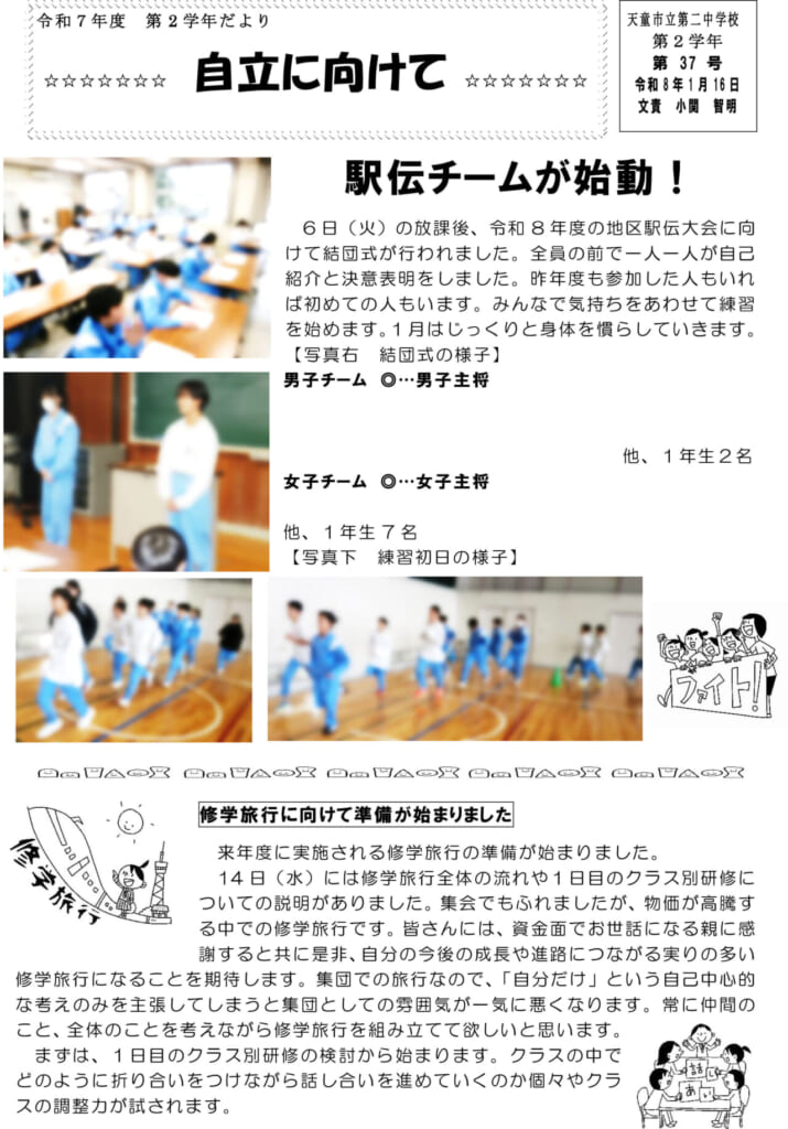 天童市立第二中学校2学年特設サイト学年通信第2学年だより 37号 令和8年1月16日